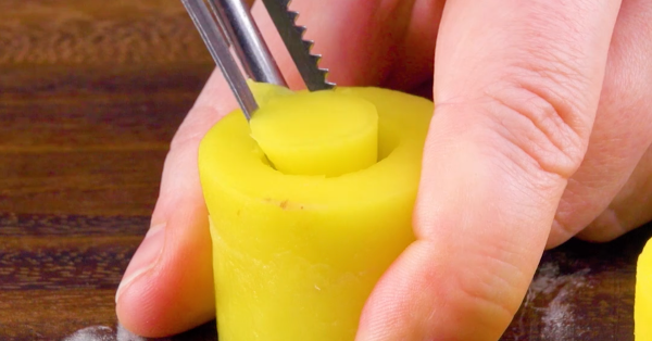 - Coupez les quatre côtés des pommes de terre puis formez quatre cylindres à l'aide d'un emporte-pièce rond. Évidez légèrement les cylindres avec la pointe d'un économe (n'allez pas jusqu'au fond).