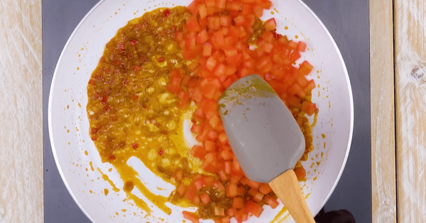 - Faites revenir les oignons, l'ail, le piment et le paprika dans une poêle. Versez ensuite les tomates et saupoudrez de sel si nécessaire.