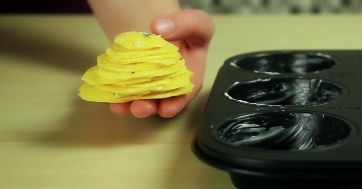 - Graissez le moule à muffins avec le reste de beurre. Empilez les tranches de pommes de terre les unes sur les autres dans le moule.