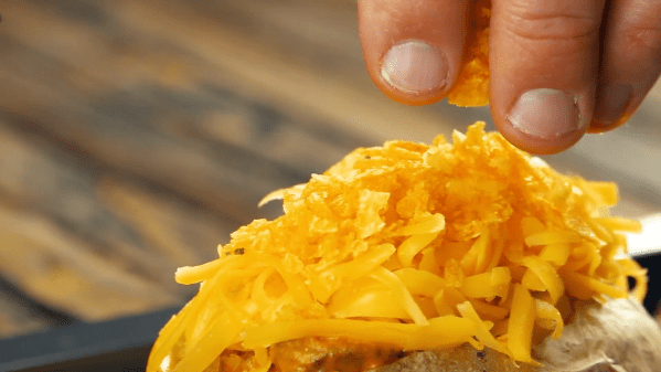 - En touche finale, saupoudrez de fromage râpé et de chips de pommes de terre. Enfin, enfournez 10 minutes à 200°C (390°F).