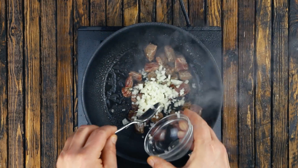 - Chauffez un peu d'huile végétale dans une poêle et cuisez le boeuf jusqu'à ce qu'il soit presque cuit. Ajoutez les oignons et l'ail.
