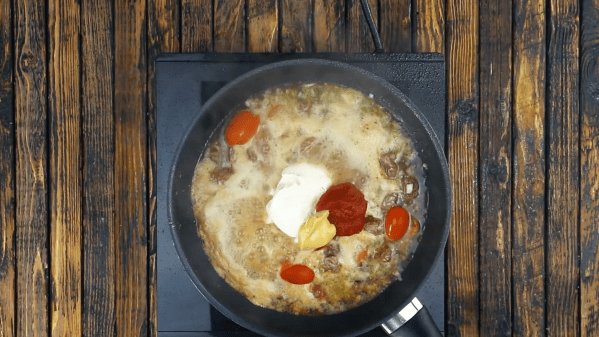 - Versez le bouillon de légumes et ajoutez les tomates cerise, la crème fraîche, le concentré de tomate et la moutarde, et mélangez bien. Salez et poivrez, et laissez mijoter pendant 10 minutes.