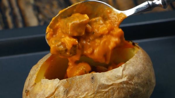 - Une fois la pomme de terre cuite (n'éteignez pas le four), découpez le dessus et creusez avec une cuillère, afin de faire de la place pour le boeuf.