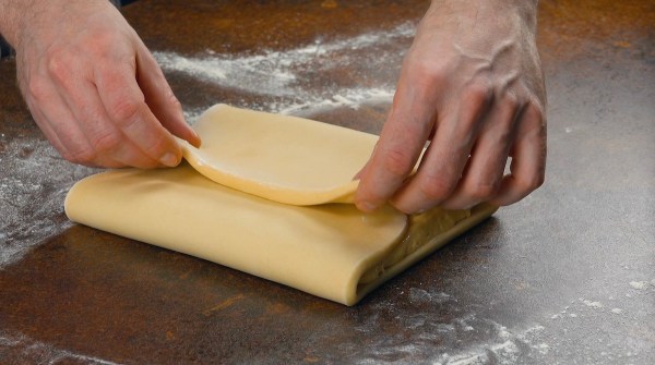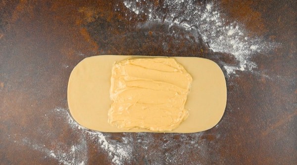 • Étalez la crème pâtissière sur une surface carrée au milieu de la pâte levée.