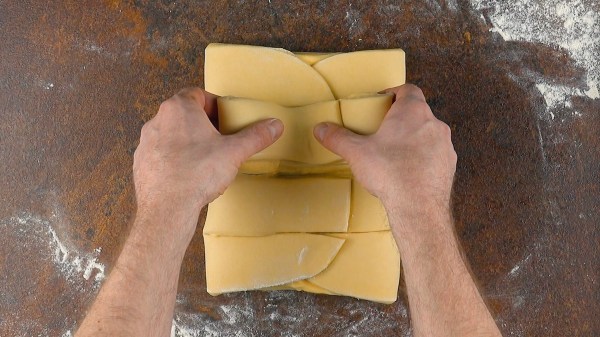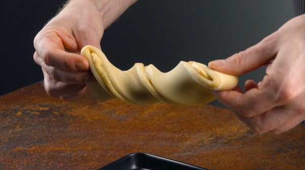 • Coupez la pâte levée fourrée de crème pâtissière en bandes de 3-4 cm d'épaisseur.