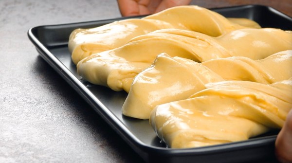 • Battez un œuf et étalez-le sur la pâte levée remplie de crème pâtissière. Ensuite, faites cuire le tout pendant 25 minutes à 180 °C.