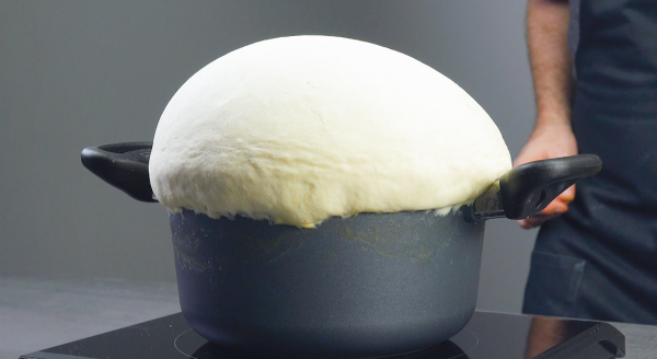 - Étalez la pâte à pizza en forme de cercle. (Elle doit être un peu plus grande que la casserole dans laquelle vous avez préparé les pâtes.) Badigeonnez le bord avec du jaune d'œuf et mettez-la sur la casserole. Appuyez bien les bords contre le bord de la casserole. La vapeur des pâtes fait lever la pâte à pizza. Lorsque le dôme est assez grand, mettez la casserole dans le four à 200°C pendant 15 minutes.