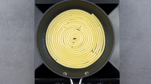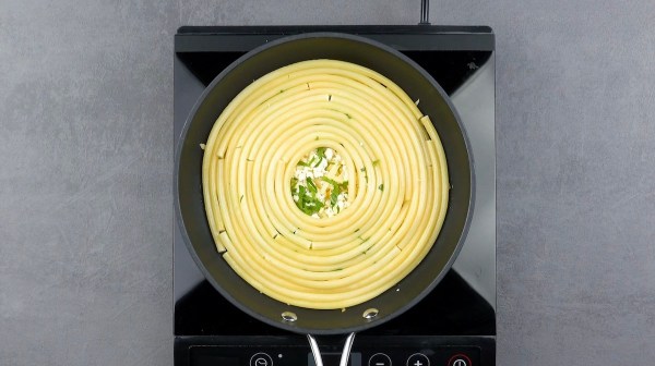 - Faites bouillir les pâtes dans de l'eau salée, rincez-les et égouttez-les. Ensuite, ajoutez de l'huile dans la poêle et disposez les pâtes en spirale.