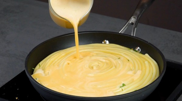 Les pâtes à la sauce tomate et les gratins de pâtes sont des recettes très populaires, presque trop ! Vous aussi, vous faites partie de ces gens dont la vie perd tout son sens sans pâtes ? Alors, vous allez adorer cette recette car nous vous présentons une nouvelle façon de préparer des bucatini, non pas avec de la sauce de façon traditionnelle, mais sous la forme d’une omelette remplie de fromage.