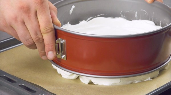 - Déposez un moule à charnière sans fond sur une plaque à pâtisserie recouverte de papier sulfurisé et versez-y la Pavlova. Retirez ensuite avec précaution le moule à charnière. Enfournez la Pavlova pendant 140 minutes à 120 °C, à chaleur tournante.