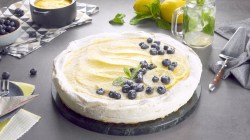 - Laissez refroidir la Pavlova dans le four avant de la recouvrir de crème au citron puis décorez-la avec du sucre glace, des tranches de citron, des myrtilles et des feuilles de menthe.