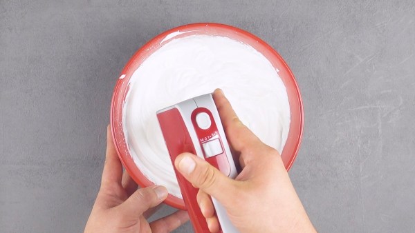 - Montez les blancs d'œufs en neige avec le sel et ajoutez le sucre tamisé et la Maïzena. Ajoutez ensuite l'arôme de vanille et le vinaigre et battez le mélange jusqu'à ce qu'il soit lisse et brillant.