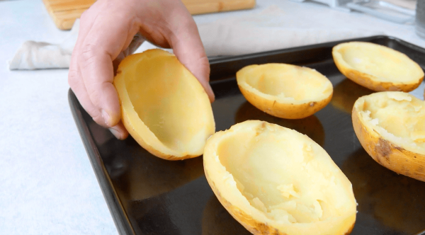 - Épluchez les pommes de terre, coupez-les en deux dans le sens de la longueur et évidez-les délicatement ; mettez l'intérieur des pommes de terre dans un récipient.