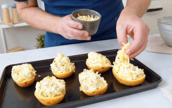 - Versez la salade de pommes de terre épicée dans les pommes de terre coupées en deux et saupoudrez le tout de mozzarella.