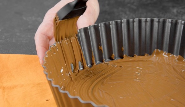 • Faites fondre 350 g de chocolat au lait au bain-marie et recouvrez le fond et les bords du moule graissé. Appliquez le chocolat en deux couches de préférence. Laissez ensuite reposer le chocolat pendant 30 minutes pour qu'il se solidifie à nouveau.