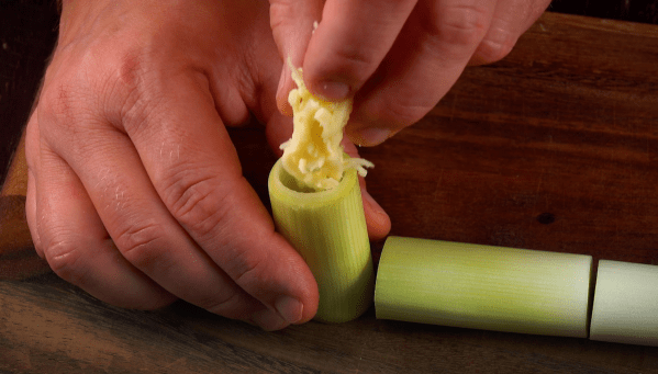 - Coupez les poireaux en morceaux de 8 à 10 cm de long. Retirez les couches internes du poireau et remplissez-le de mozzarella râpée. Vous aurez besoin d'un total de 8 rouleaux de poireaux farcis.