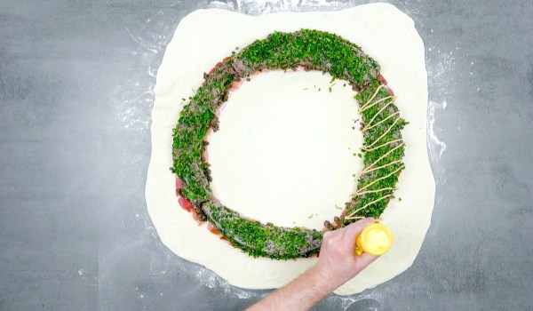 - Badigeonnez le bord de la pâte à pizza avec le jaune d'œuf battu. Pliez ensuite la pâte à pizza vers l'intérieur de façon à recouvrir les champignons et la viande de bœuf.