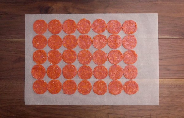 • Déposez les tranches de chorizo sur du papier cuisson (5 rangées de 7 tranches).