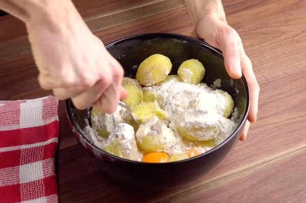 • Dans un saladier, écrasez les pommes de terre avec les épices, les œufs et la farine.