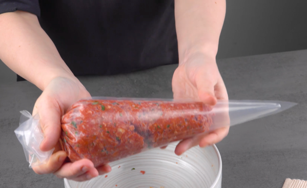 • Mettez la viande hachée, l'œuf, le paprika, le persil, le pain de mie émietté (trempez-le au préalable dans un peu d'eau ou de lait puis pressez le liquide), le sel et le poivre dans un saladier et mélangez le tout. Versez le mélange dans une poche à douille.
