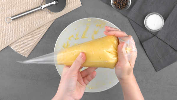 • Faites bouillir les pommes de terre et mettez-les dans un saladier. Ajoutez la noix de muscade, le sel et les œufs et versez également le mélange dans une autre poche à douille.