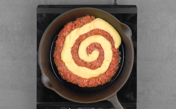 • Mettez un peu d'huile dans une poêle et dessinez une spirale avec la viande hachée. Remplissez les espaces intermédiaires avec la purée de pommes de terre.