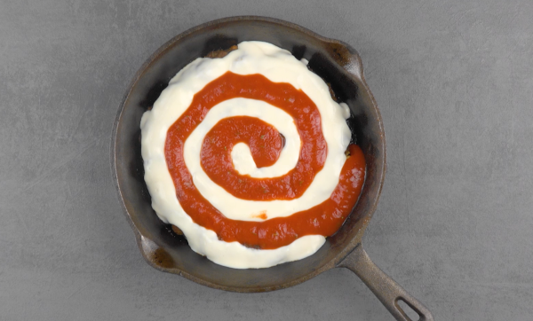 • Versez maintenant la sauce béchamel et la sauce tomate également en spirale sur la préparation viande-purée de pommes de terre.