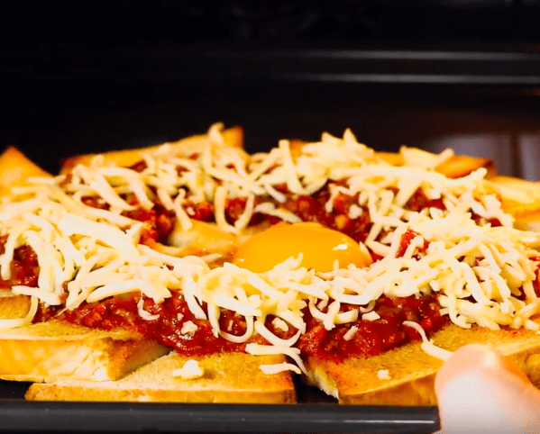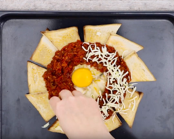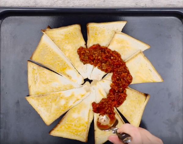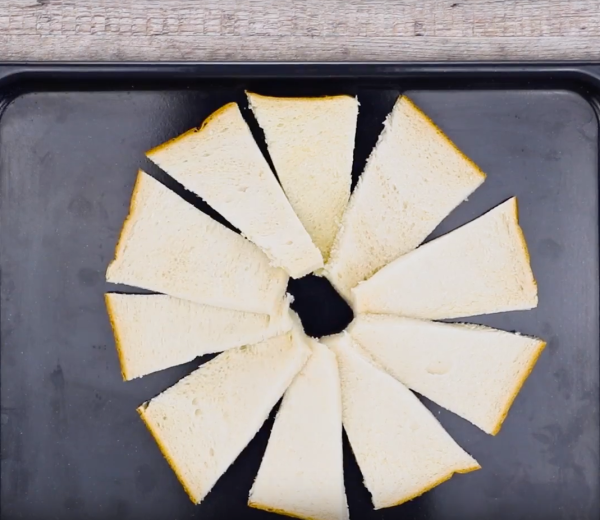 - Aplatissez le centre de votre cercle de pain de mie pour assembler au mieux les tranches ensemble. Enfournez pendant 3 minutes.