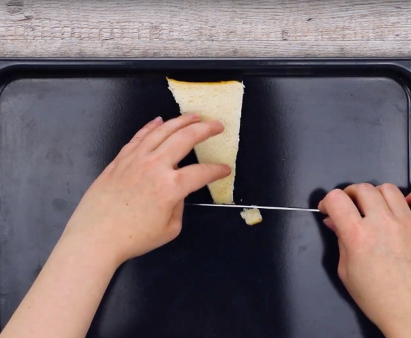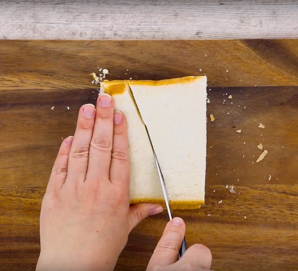 - Coupez maintenant vos tranches en deux, dans la diagonale (c’est mieux si les deux moitiés ne sont pas parfaitement égales).