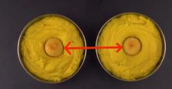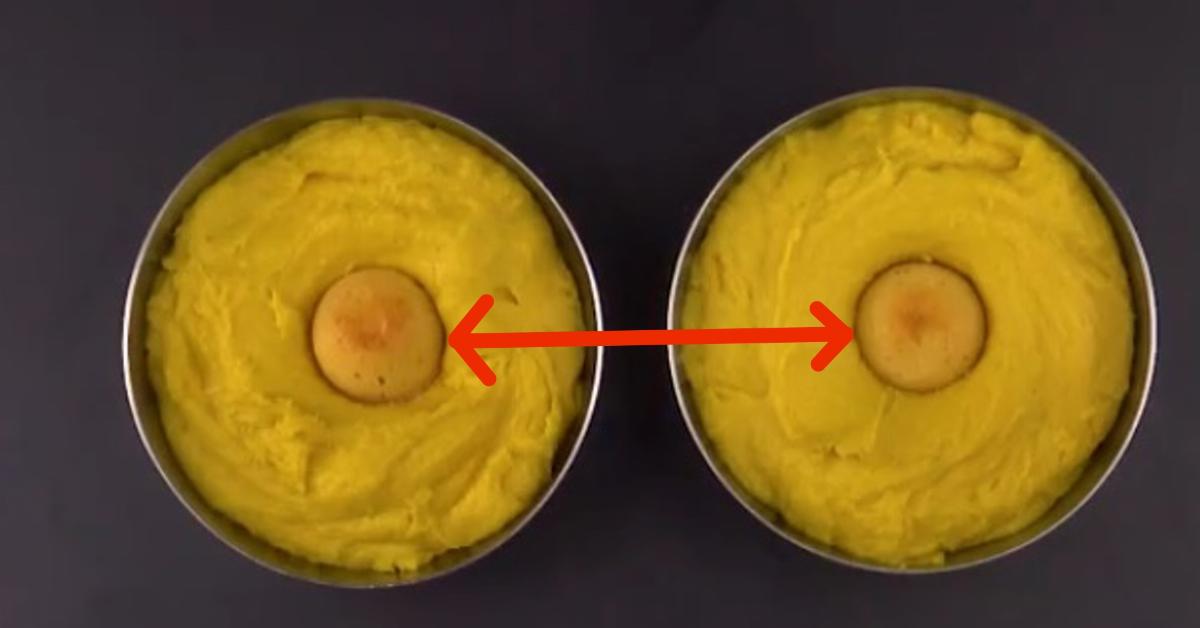 • Versez la pâte jaune dans deux saladiers de taille égale. Retirez ensuite les boulettes de pâte refroidies du moule et enfoncez-les au centre du mélange de pâte. Placez les deux saladiers avec la pâte jaune et la boule à gâteau dans le four, à 160 °C pendant 45 minutes à chaleur tournante.