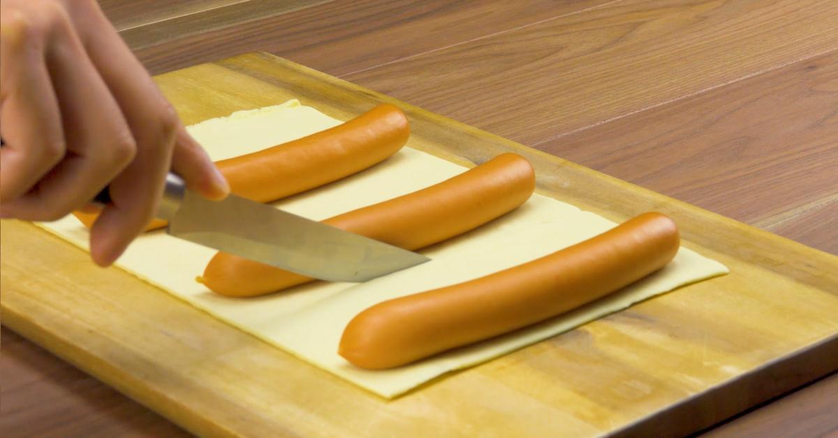 • Faites chauffer le four à 180°C (Thermostat 6 - 350°F). Découpez la pâte feuilletée en trois parties égales, dans le sens de la hauteur. Sur chacune, déposez une saucisse que vous enroulez dans la pâte.