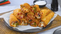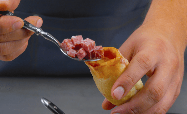 - Pour la version au salami, versez de la sauce tomate, du piment, du salami, de la mozzarella et de l'origan à l'intérieur. Pour la version aux lardons, remplissez de sauce tomate, de champignons, de lardons, de mozzarella et de persil. Pour la version végétarienne, remplissez de sauce tomate, d'oignon, de poivrons, d'olives noires, de mozzarella et de basilic.