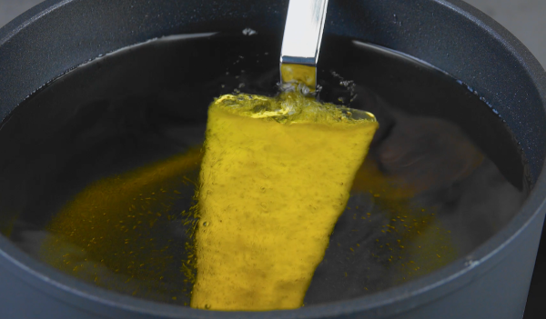 - Faites chauffer l'huile pour frire dans une casserole à environ 160 °C, plongez-y la pelle à tarte et laissez-la chauffer brièvement. Ensuite, sortez-la et essuyez la graisse avec un torchon de cuisine. Plongez la spatule chaude dans la pâte pendant environ 5 secondes, puis maintenez-la à nouveau dans l'huile chaude de la casserole jusqu'à ce que la pâte se colore un peu.