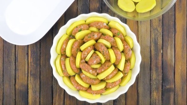 - Dans le plat à tarte, disposez des tranches de pommes de terre en alternant avec les boulettes de viande. Il est préférable de commencer avec les pommes de terre au bord et de travailler ensuite en alternance jusqu'au milieu du plat.