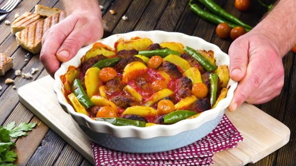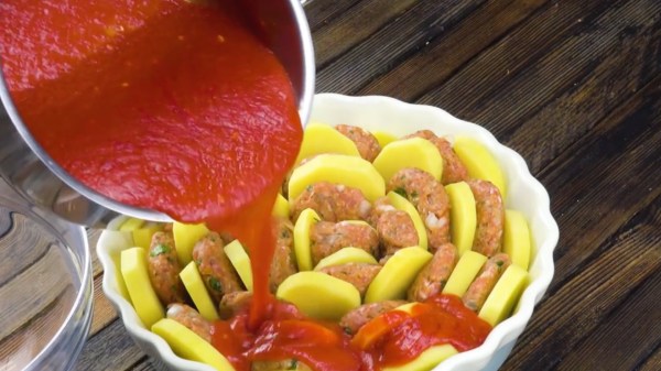 - Faites chauffer de l'huile dans une casserole pour faire revenir l'ail. Ajoutez ensuite la purée de tomates et les épices et remuez bien. Versez la sauce uniformément sur les pommes de terre et les boulettes de viande.