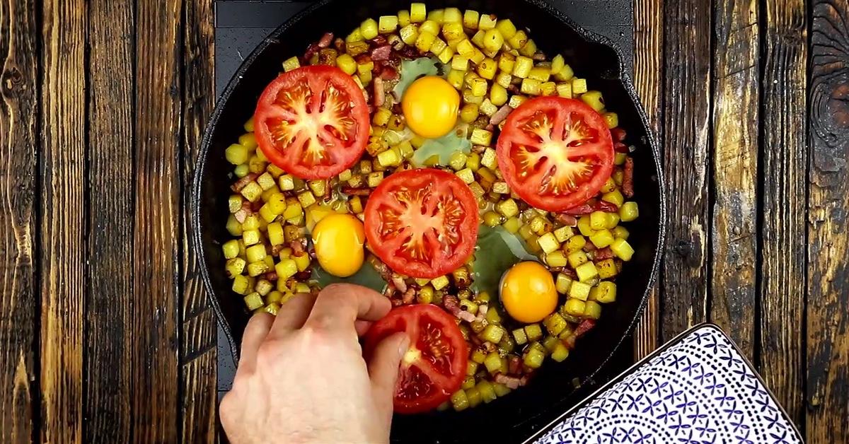 - Réalisez ensuite trois trous dans la poêle et cassez des œufs à l'intérieur. Déposez ensuite des tranches de tomates par-dessus la poêlée et recouvrez avec un couvercle. Laissez cuire pendant encore 5 minutes.