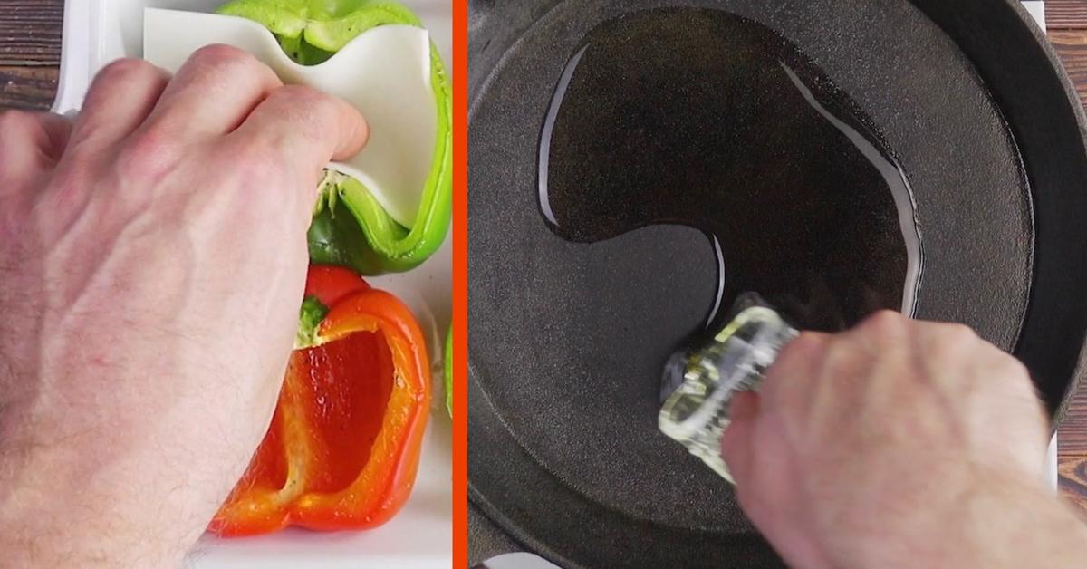 - Prenez ensuite 6 tranches de mozzarella et mettez-les dans les moitiés de poivrons. Remplissez délicatement les poivrons avec le mélange de rumsteak.