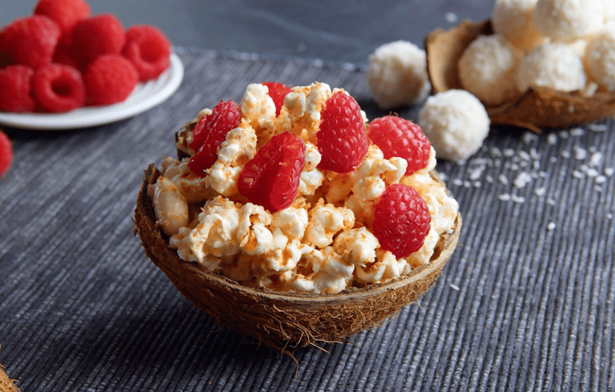 Versez l’huile végétale dans une casserole à feu moyen et laissez-la se réchauffer. Ajoutez les grains de pop-corn et les boules de noix de coco Raffaello aplaties dans la casserole, couvrez avec un couvercle et attendez que les grains de pop-corn finissent d’éclater. Mélangez puis versez le pop-corn dans un bol et garnissez de framboises fraîches avant de servir.