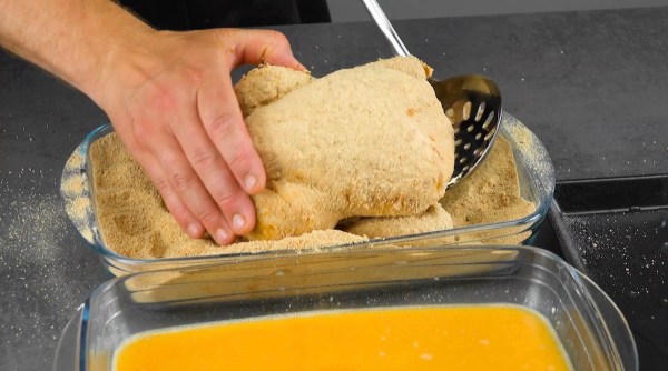 Battez ensuite les œufs que vous versez ensuite dans un plat à gratin. Mélangez la chapelure, la semoule de maïs, le paprika, la coriandre, le sésame et le sel dans un autre plat. Roulez d'abord le poulet dans les œufs battus puis panez-le avec le mélange de chapelure.