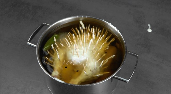 • Le lendemain, préparez d'abord le bouillon : portez tous les ingrédients à ébullition dans une grande casserole. Laissez ensuite refroidir le bouillon à environ 65 °C, ajoutez-y le poulet et laissez-le tremper toute la nuit dans le bouillon.