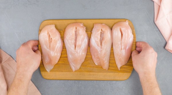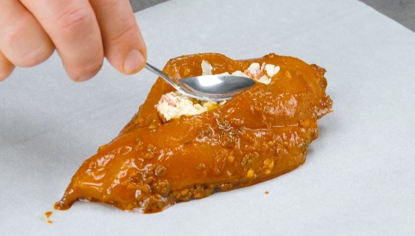 - Coupez les blancs de poulet en deux, formez une poche dans chaque morceau avec un couteau.