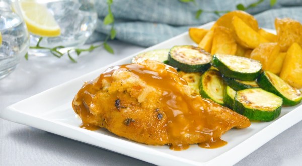 - Au moment de servir, versez le jus de viande qui s'est accumulé dans le papier sulfurisé sur les blancs de poulet, cela les rend encore plus juteux. Le meilleur accompagnement pour ce poulet cuit au four : une garniture de légumes et des quartiers de pommes de terre croustillants.