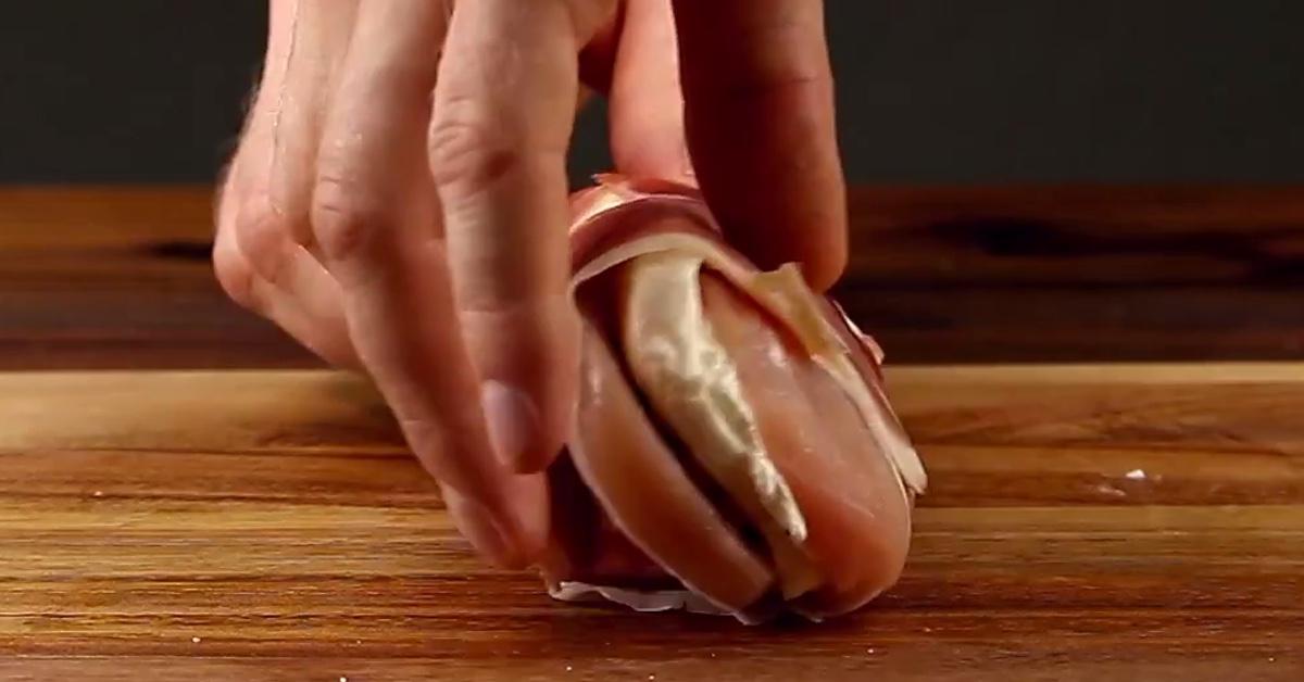 - Enveloppez le poulet avec les tranches de jambon, faites chauffer de l'huile dans une poêle et faites légèrement frire la viande des deux côtés.