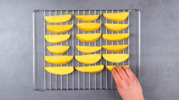 • Coupez les pommes de terre en quartiers, puis placez-les sur une grille allant au four. Mettez-la sur le cran du milieu dans le four.