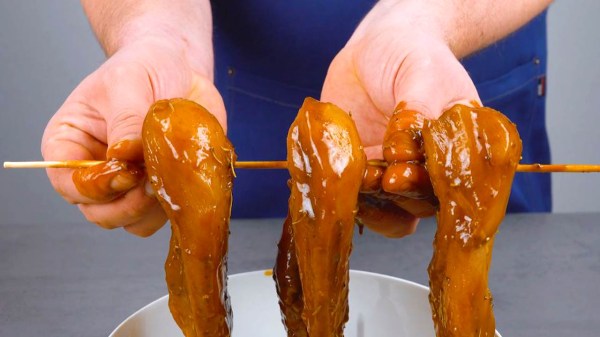 • Retirez les blancs de poulet du bol et embrochez les 3 à la fois sur une brochette en bois.