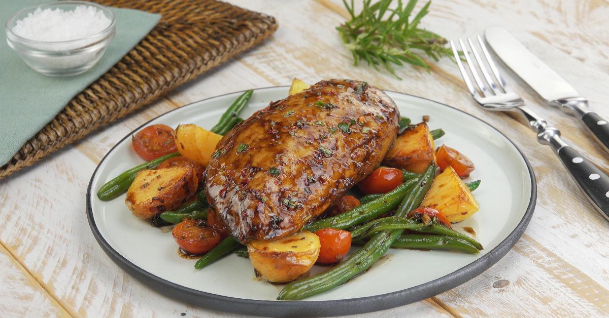 - Une fois la cuisson des pommes de terre terminée, sortez la plaque du four et ajoutez les haricots verts directement sur la plaque ainsi que les tomates cerises découpées. Lorsque la viande a fini de mariner, ajoutez les blancs de poulet directement dans le plat et versez la marinade par-dessus. Enfournez 30 min à 180°C.