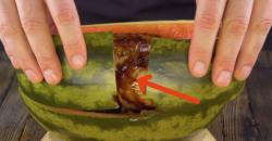 • Mettez la pastèque sur votre surface de travail avec une extrémité tournée vers vous. Coupez un morceau épais, comme montré dans la vidéo. Sur le côté opposé, coupez une fine tranche. Posez ensuite la pastèque à l'endroit où vous venez de couper la tranche la plus fine pour la maintenir en place puis récupérez la chair du fruit à la cuillère. Placez le poulet à l'intérieur de la pastèque et remettez le "couvercle" par-dessus.