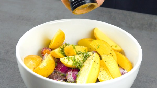 - Commencez par couper les carottes, les oignons et les pommes de terre en gros morceaux et mettez-les dans un saladier. Hachez ensuite une branche de romarin, ajoutez 3 cuillères à soupe d'huile d'olive, du sel et du poivre et mélangez le tout.