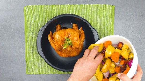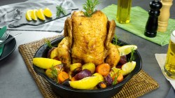 - Placez le poulet et les légumes dans le four à 175 °C pendant environ 1 heure, en mode convection.