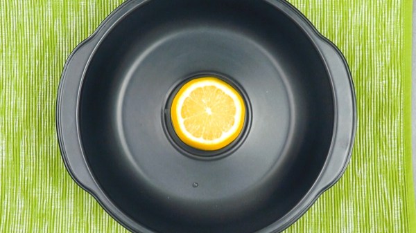 - Coupez la partie supérieure d'un citron et placez-le, chair vers le haut, dans le trou d'un moule à savarin.